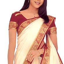 Eye pleasing ivory crepe silk saree with a mini pallu in Maroon with a line of elephants standing majestically...With blouse.