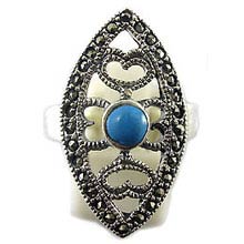 This beautiful Art Deco filigree ring features a securely bezel set turquoise flanked by elegant marcasites. The timeless style of this exquisite must-have classic ring is sure to be cherished for generations to come. ' - Jewelrydays offers a 100% money back guarantee only if the jewellery is deemed as misrepresented.